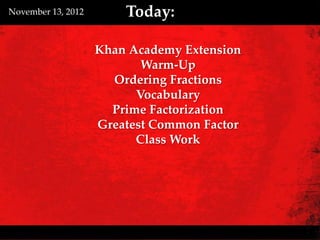 The document is a summary of a Khan Academy math lesson on ordering fractions, prime factorization, and working with fractions. It includes warm-up problems on ordering fractions, adding and subtracting fractions with different denominators, and multiplying and dividing mixed numbers. It defines key vocabulary terms like fundamental theorem of arithmetic, prime number, prime factorization, and greatest common factor. It provides examples of using prime factorization to simplify fractions by finding their greatest common factor. It also includes practice problems identifying numbers as prime or composite, writing their prime factorizations, and finding the prime factorizations of given numbers.