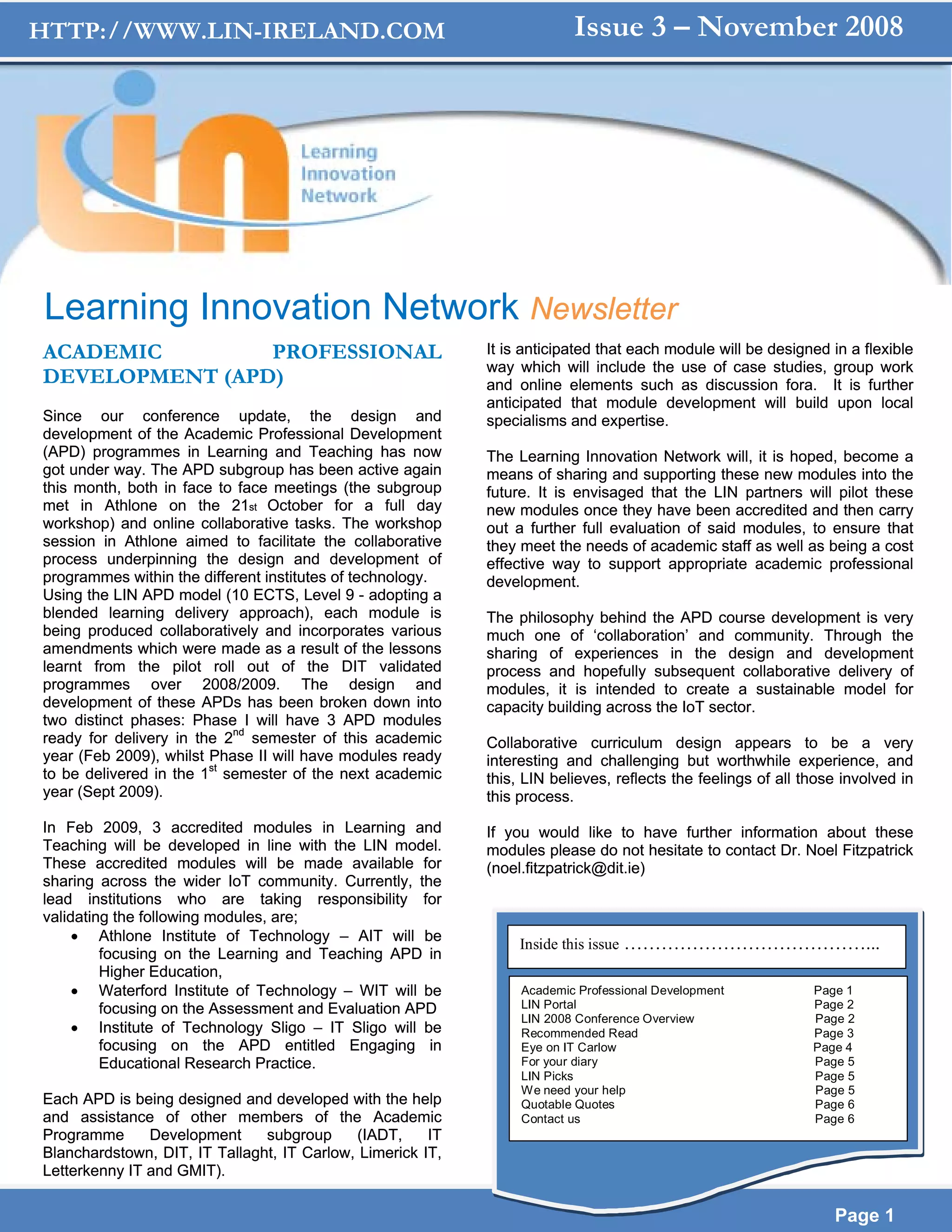 The document discusses the development of Academic Professional Development (APD) modules through the Learning Innovation Network (LIN). It provides details on: