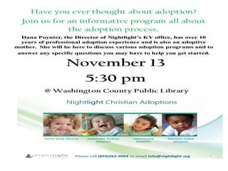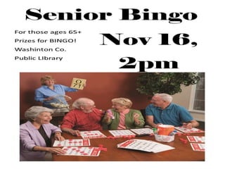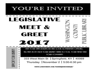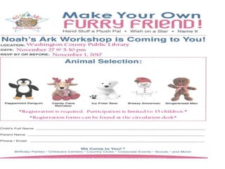 The document lists the children's, tween and teen, and adult programs taking place at the Washington County Public Library in November. Children's programs include storytimes on Mondays, Wednesdays, and Tuesdays. A special "Meet My Plate" program about healthy eating will be held on November 14th. The Washington County Public Library Board of Trustees open meeting is scheduled for November 20th at 5:30 pm and allows for public comment with advance notice and a two minute limit per person.