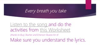This lesson plan focuses on the themes of relationships, jealousy, and violence against women. Students will listen to the song "Every Breath You Take" and discuss the feelings and relationship dynamics portrayed. They will also brainstorm words related to jealousy and discuss whether it is generally positive or negative. Characteristics of healthy and unhealthy relationships will be considered. Finally, students will learn about the International Day for the Elimination of Violence Against Women on November 25th.