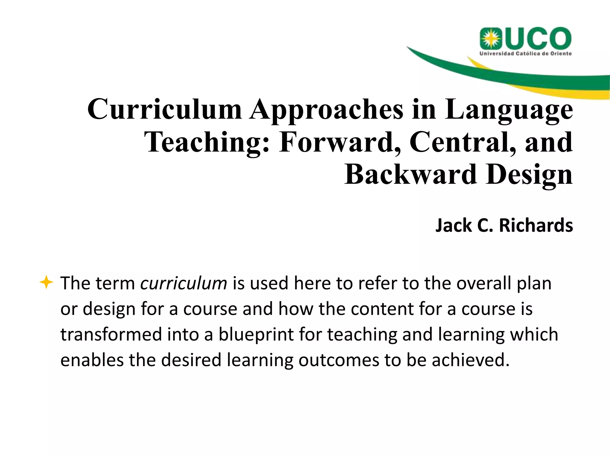 This document discusses three approaches to curriculum design in language teaching: forward, central, and backward design. Forward design starts with choosing a topic and resource, then plans instructional methods and assessment. Central design prioritizes teaching activities over syllabus or outcomes. Backward design begins with specifying learning outcomes and uses them to develop the syllabus, materials, teaching, and assessment.