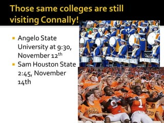 The document lists several college athletic games for a university against various opponents on specific dates in November. It then provides demographic and statistical information about the university, such as its status as a public liberal arts college, enrollment numbers, tuition costs, popular majors, and admissions standards. The takeaway is that admission to the university is not highly selective.