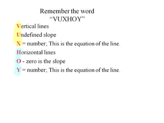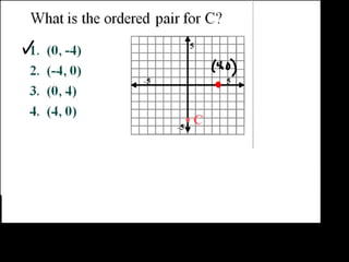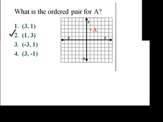 This document discusses key concepts related to coordinate planes, plotting points, finding slopes of lines, and using slopes to determine which section of a ski slope is steepest. It provides examples of simplifying fractions, finding slopes using the point-slope formula and between points, and plotting a ski slope problem on the coordinate plane to determine the steepest section using slopes. Objectives are to understand the coordinate system, plot and label points, and find slopes using various methods.