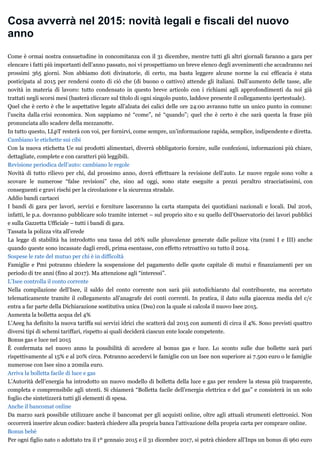 Il documento dettaglia le novità legali e fiscali in Italia per il 2015, con cambiamenti significativi in ambiti come tasse, lavoro e servizi pubblici. Tra le principali novità ci sono l'aumento della tassazione su polizze vita, l'introduzione della dichiarazione dei redditi precompilata e la revisione delle normative sul lavoro. Sono previsti anche incentivi per le famiglie e misure per migliorare la trasparenza nei servizi pubblici.