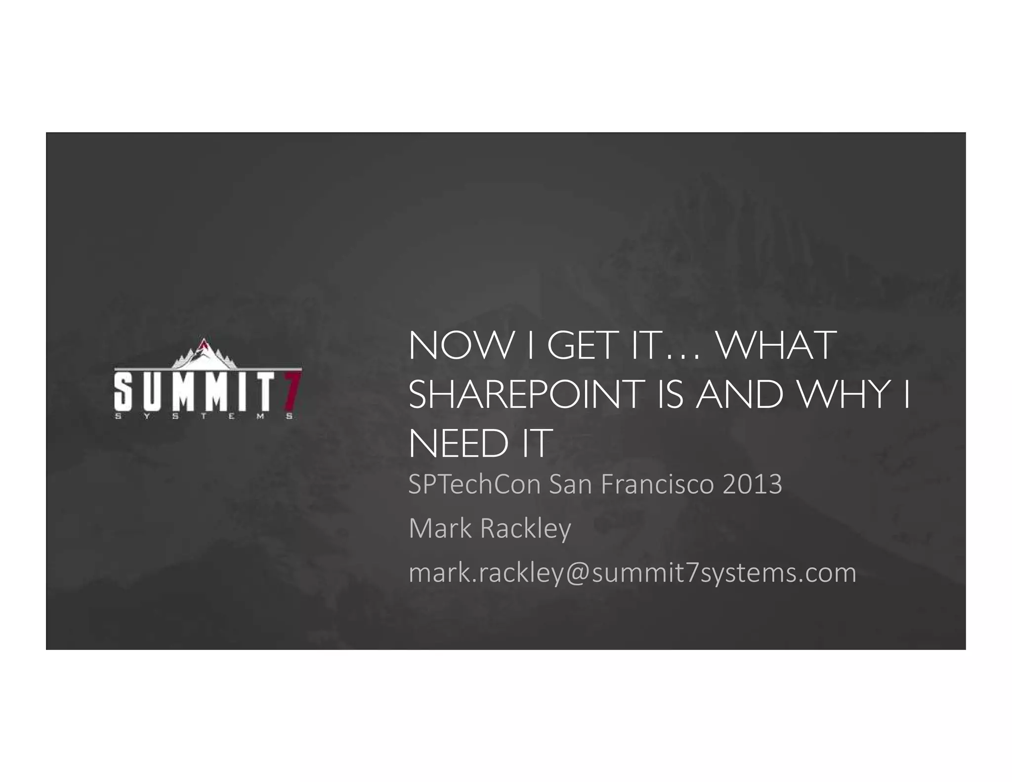 This document discusses SharePoint and why it can be difficult to understand. It begins by explaining that there is a lot of information available about SharePoint but it is conflicting and noisy, making it hard to know where to start. It also notes that SharePoint requires changing how people work. The document then defines SharePoint as a collaboration and organization platform that can be customized. It provides tips to avoid SharePoint pain, such as not expecting clear error messages. Finally, it emphasizes the importance of joining the SharePoint community to learn from others.