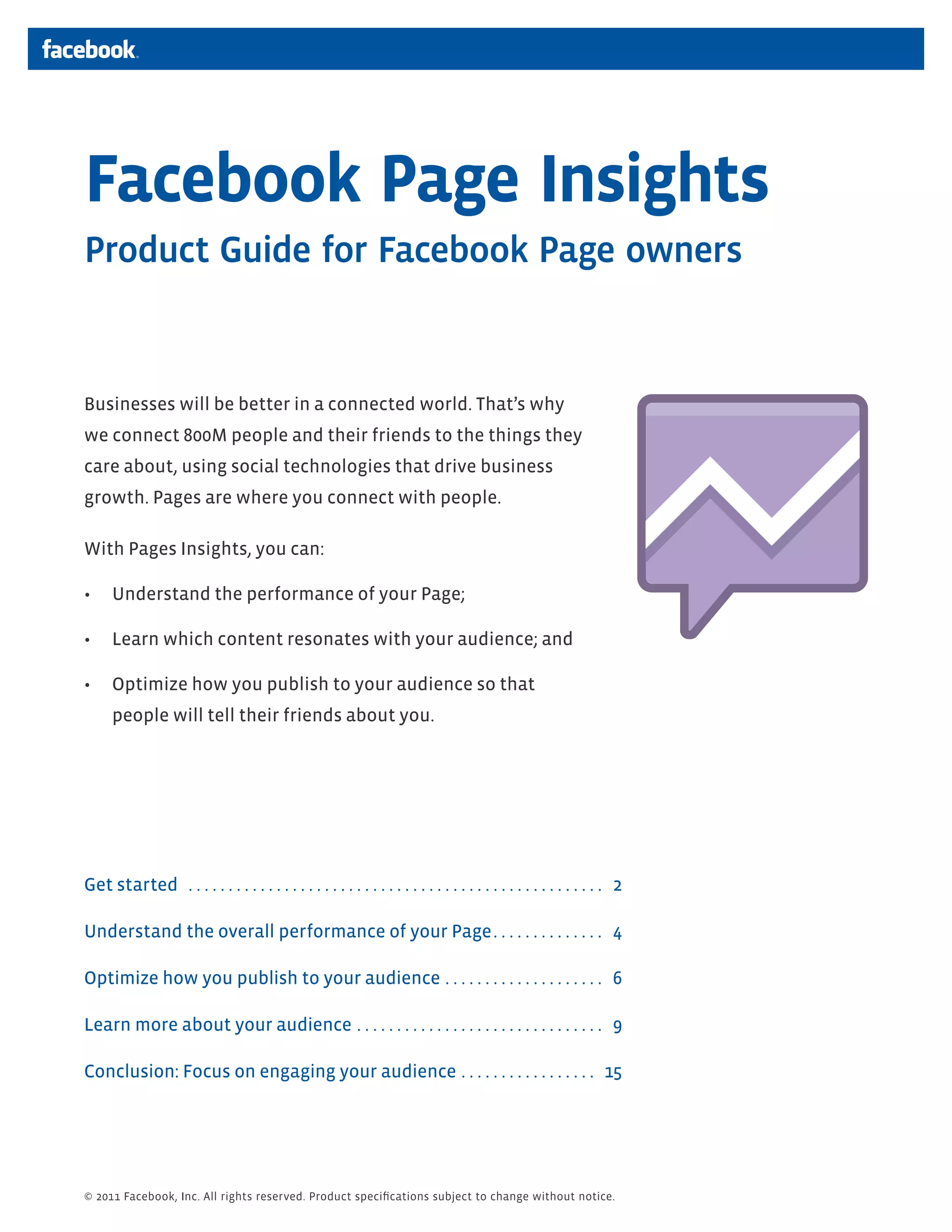 The Facebook Page Insights product guide provides tools for page owners to analyze their performance, understand audience engagement, and optimize content publication. It features metrics on total likes, reach, and audience demographics, enabling businesses to target their posts effectively. Additionally, users can access detailed analytics on individual posts and audiences to enhance their marketing strategies.