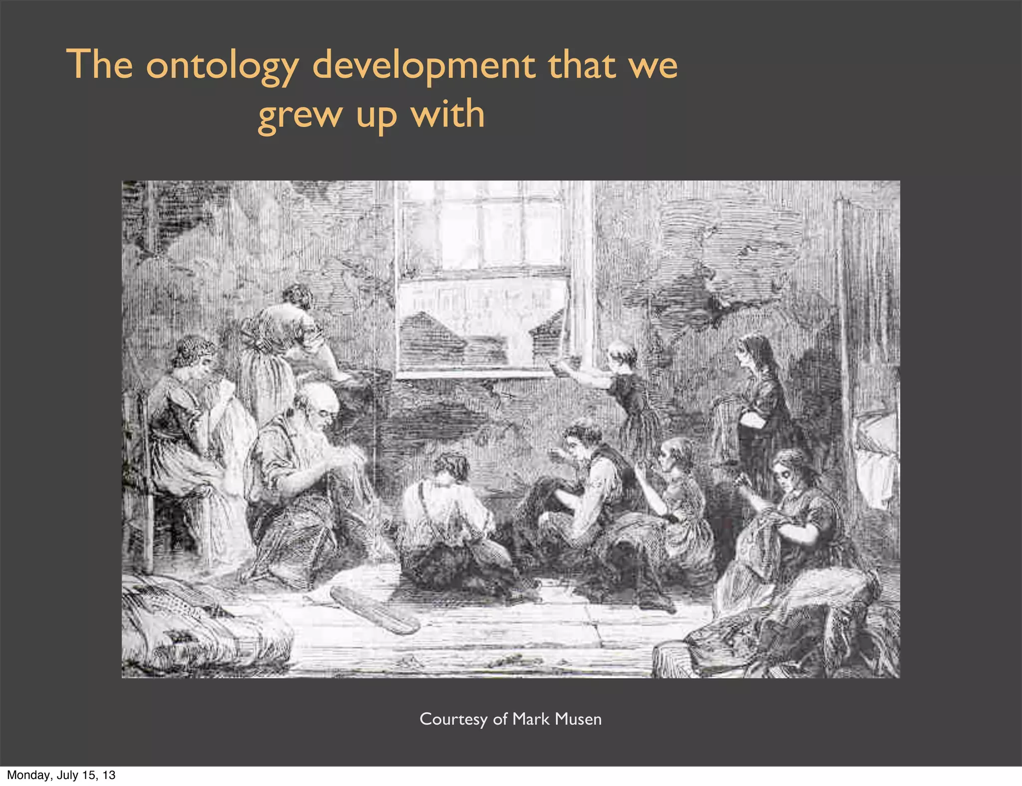 This document discusses collaborative ontology development. It notes that ontology development has shifted from being done by lone knowledge engineers to being done collaboratively by distributed groups. It provides examples of large ontologies developed collaboratively like Gene Ontology, NCI Thesaurus, and International Classification of Diseases. It describes the collaborative development processes used for these ontologies including things like issue tracking systems, multiple editors, and consensus building. It also discusses the WebProtege tool which aims to provide a collaborative online environment for ontology development similar to Google Docs.