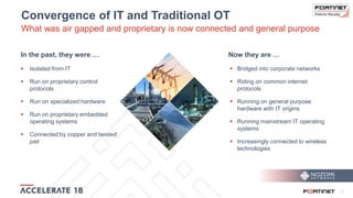 The document discusses the convergence of IT and operational technology (OT), highlighting the vulnerabilities of industrial control systems (ICS) and the increasing threats from cyber attacks such as Stuxnet and Industroyer. It emphasizes the need for integrated cybersecurity solutions tailored for ICS, showcasing Fortinet and Nozomi Networks' products that monitor and protect against various threats while ensuring system performance. The document also includes insights from a SANS survey on threat vectors and security technologies in use within the ICS environment.
