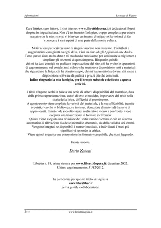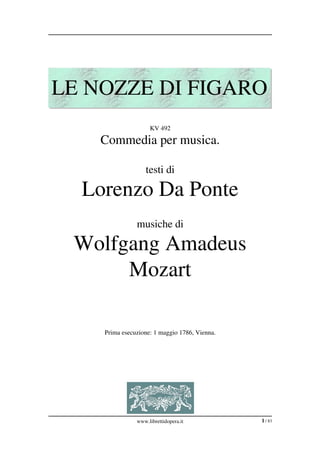 Le nozze di Figaro è un'opera musicale di Wolfgang Amadeus Mozart, con libretto di Lorenzo Da Ponte, andata in scena per la prima volta il 1 maggio 1786 a Vienna. Il documento fornisce informazioni sui personaggi, l'ambientazione e il processo di creazione del libretto, evidenziando l'intento divulgativo del sito www.librettidopera.it. Vengono anche menzionati ringraziamenti a diverse persone e fonti che hanno contribuito alla realizzazione del progetto.