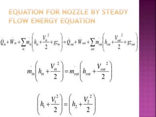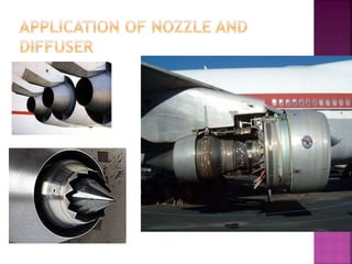 This document discusses nozzles and diffusers. It defines nozzles as devices that increase velocity and decrease pressure, and defines diffusers as devices that decrease velocity and increase pressure. Equations for steady flow through nozzles and diffusers using the energy equation are presented. Convergent nozzles are used in most aircrafts while convergent-divergent nozzles are used in supersonic aircraft. The Bernoulli principle is cited to explain how pressure decreases with decreasing area while velocity increases. The conclusion compares flow quality through different nozzle types.