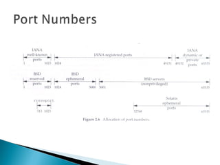 The document discusses inter-process communication and network protocols. It describes two forms of IPC - local and network IPC. Local IPC allows communication between processes on the same host using mechanisms like pipes, FIFOs, message queues and shared memory. Network IPC allows communication between processes on different hosts using sockets. It provides examples of client-server communication over a local Ethernet network and across different LANs connected by a WAN. It also discusses TCP and UDP protocols, and how TCP establishes and terminates connections using three-way and four-way handshakes.