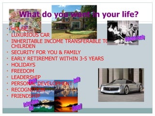 The document discusses creating wealth and achieving financial freedom through network marketing. It emphasizes owning your own business and making passive income through recruiting others. It outlines a 4-step system to build a team and earn residual income by sharing health products and the business opportunity with others who will also recruit partners. The goal is to have a large team in place within a year that generates substantial monthly residual income.