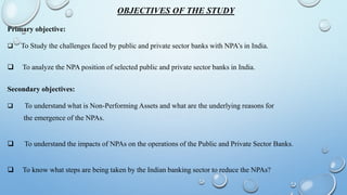 This document is a project report on non-performing assets (NPAs) in Indian commercial banks. The primary objectives are to study the challenges faced by public and private sector banks with NPAs and analyze the NPA position of selected banks. Secondary objectives are to understand what NPAs are, their underlying causes, and their impacts on bank operations. The report finds that NPAs are increasing yearly for all commercial banks due to rising loan amounts. It provides data on the gross NPAs and percentages for various public sector banks in 2013-14, with one bank having the highest gross NPAs and another having the highest NPA percentage. The report recommends actions like securitization, improved staff training, and motivating delinquent customers to reduce