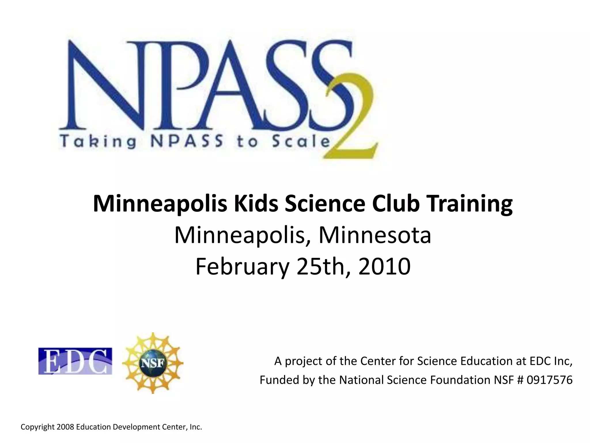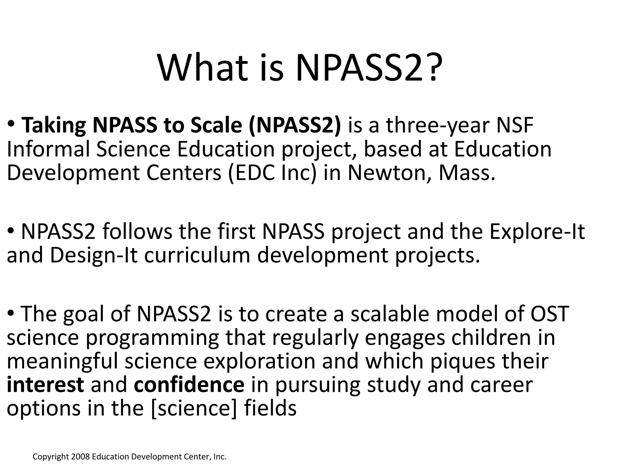 This document provides information about the NPASS2 project, which aims to create a scalable model for out-of-school time science programming. It discusses the goals of engaging children in science exploration and increasing their interest in science fields. It then outlines challenges for a roller coaster design activity, including challenges to design ski jumps, hills and valleys tracks, and loops and spirals. It discusses teaching competencies for out-of-school time science and closing the activity with a discussion.