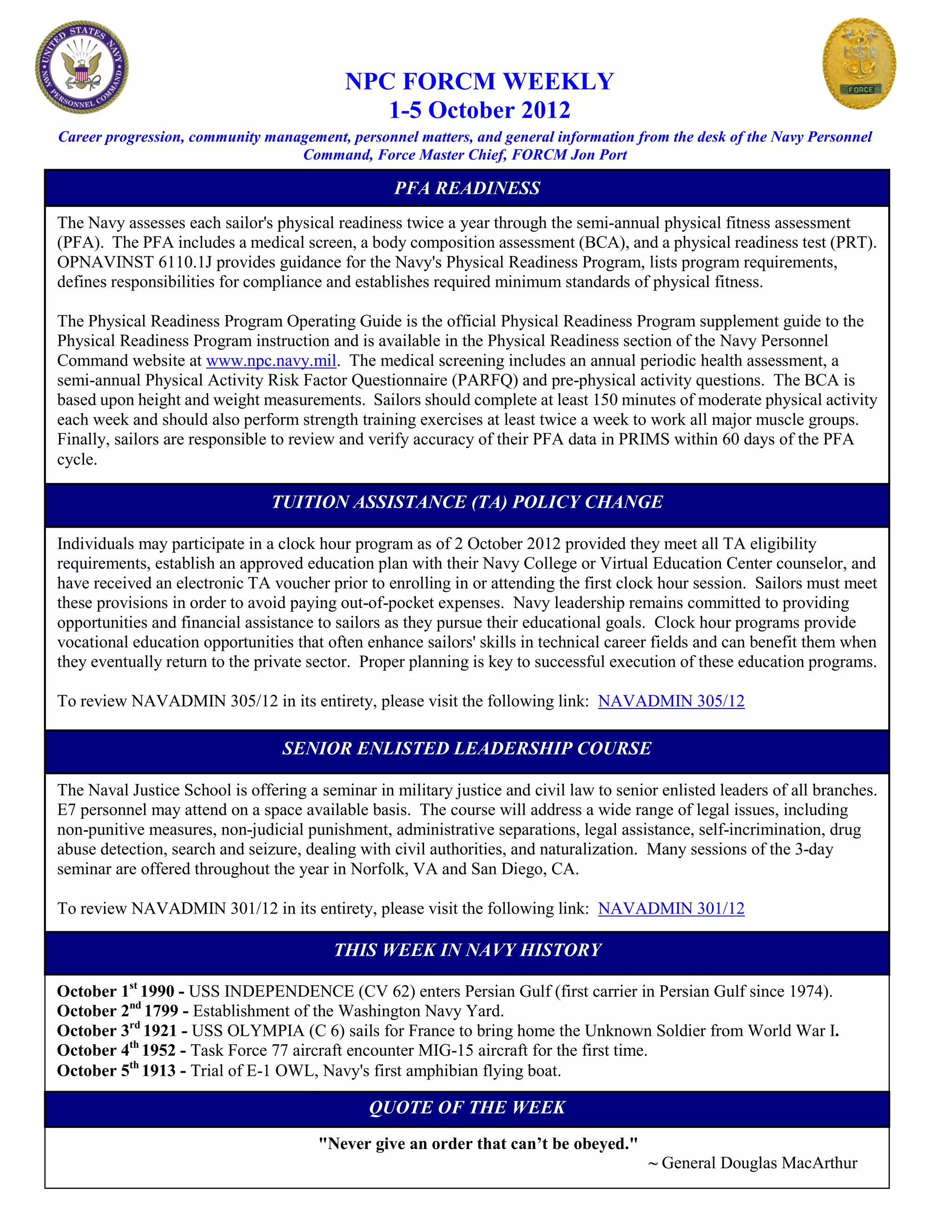 The document outlines the Navy's physical readiness program, including requirements for the semi-annual physical fitness assessment and guidelines for maintaining physical fitness. It also announces changes to tuition assistance policy for participating in clock hour programs and addresses opportunities for educational advancement for sailors. Additionally, it highlights a senior enlisted leadership course offered by the Naval Justice School and notes significant historical events in Navy history occurring from October 1-5.