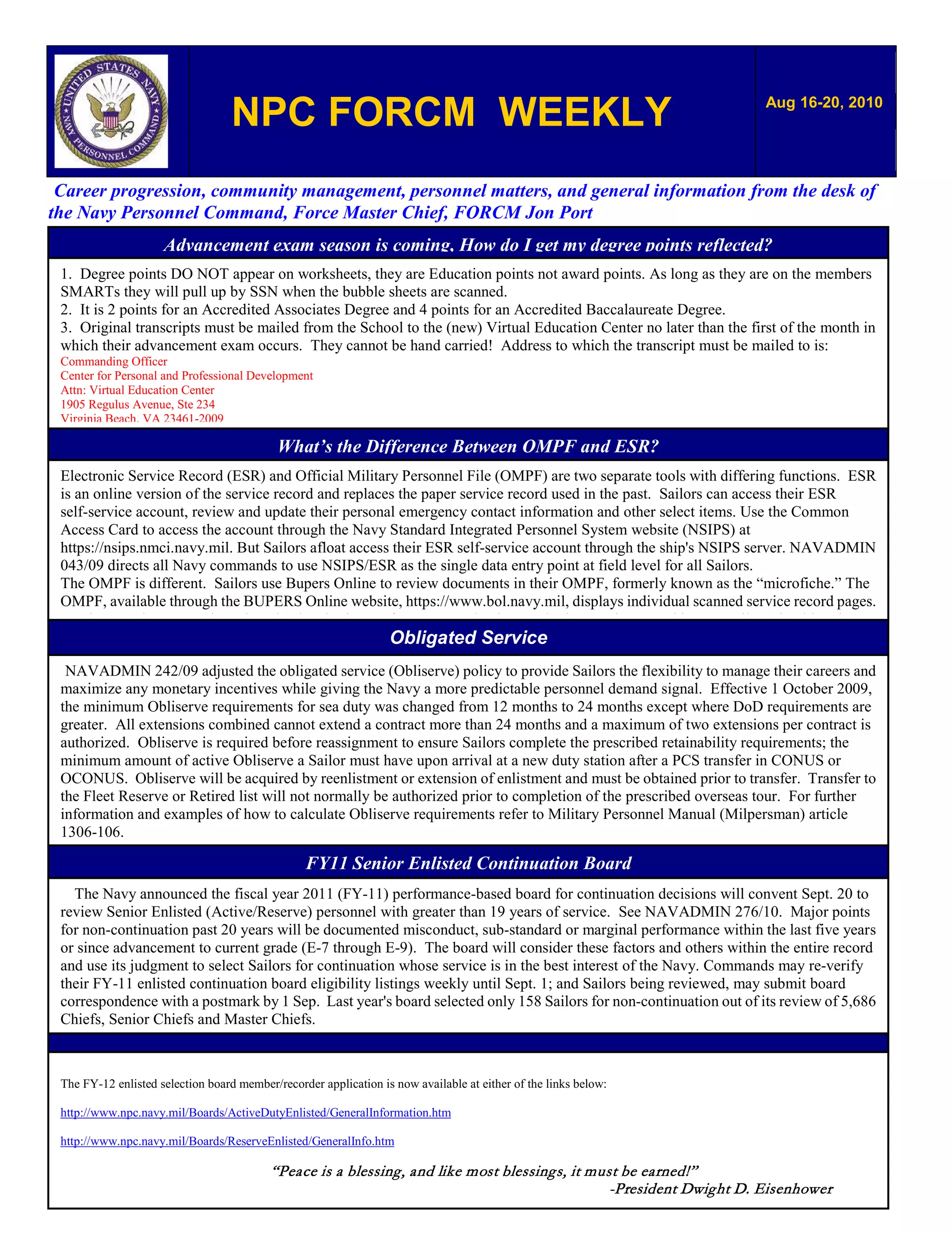 1) The document provides information on advancement exams, obligated service requirements, the difference between the Electronic Service Record and Official Military Personnel File, and the FY11 Senior Enlisted Continuation Board.