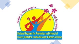 This document summarizes the National Programme for Prevention & Control of Cancer, Diabetes, Cardiovascular Diseases and Stroke (NPCDCS) in India. It notes that NCDs account for 60% of deaths in India and aims to provide early diagnosis and management of common NCDs. The program has two components: (1) diabetes, cardiovascular diseases and stroke, focusing on prevention, capacity building, and integrating management into primary healthcare; and (2) cancer control, with objectives of prevention, screening and strengthening comprehensive therapy. It outlines the activities, schemes and initiatives undertaken at various levels of healthcare to implement this national program.