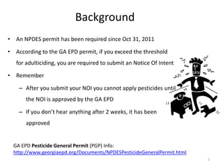 The document provides information on NPDES permitting requirements for pesticide application in Georgia. It explains that operators applying above thresholds must submit a Notice of Intent to be covered under the Pesticide General Permit. It provides details on calculating acreage sprayed and record keeping requirements, including developing Pesticide Discharge Management Plans, maintaining records of applications and equipment, filing reports of any adverse incidents, and compiling biennial reports. Contact information is also included for the Georgia Environmental Protection Division NPDES coordinator and an NPDES update email list.