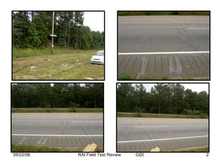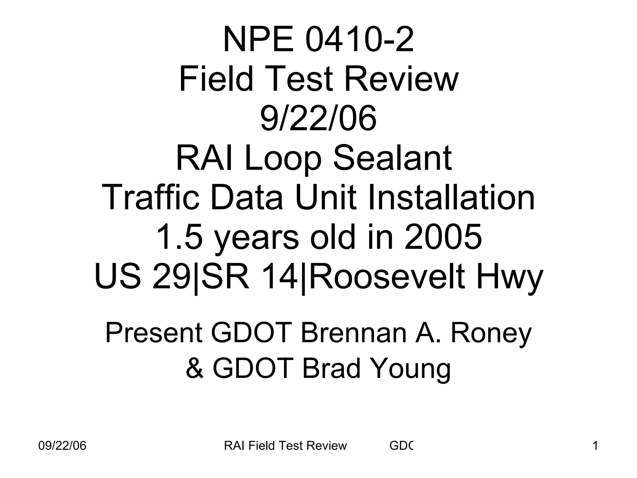 The document discusses a field test review from September 22, 2006 of a loop sealant and traffic data unit installation that was 1.5 years old on US 29/SR 14/Roosevelt Highway. The review was conducted by Brennan A. Roney and Brad Young of the Georgia Department of Transportation.
