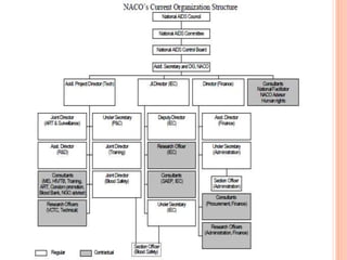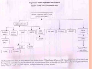The document compares the administrative structures and components of India's National Tuberculosis Control Program (RNTCP) and National AIDS Control Program. For RNTCP, the structure includes a central Tuberculosis Division and state/district-level TB cells. For AIDS, central oversight is provided by a National Council, Committee, and Board, while states have councils and districts have manager-led committees. Both programs pursue expansion, research, and health system strengthening, but AIDS focuses more on prevention for high-risk groups and comprehensive care/treatment.