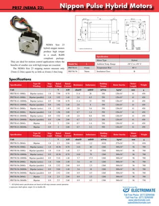 Nippon Pulse Hybrid Motors produces the PR57 series of NEMA Size 23 hybrid stepper motors. The PR57 motors are ideal for applications requiring small size but high torque. They measure only 23mm square and as short as 41mm long. The document provides specifications for various PR57 motor models, including their winding type, step angle, voltage, current, resistance, inductance, torque, inertia, length, and weight.