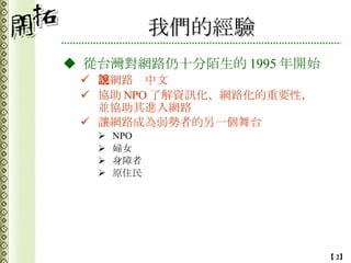 文档描述了自1995年以来在台湾为非营利组织(NPO)提供网络支持和信息化促进的经验。通过与妇女、身障者和原住民团体合作,推动了信息技术的应用,建立了多个在线平台和社区,提高了服务质量并缩小了数字鸿沟。文中强调了合作共创和资源共享的重要性。