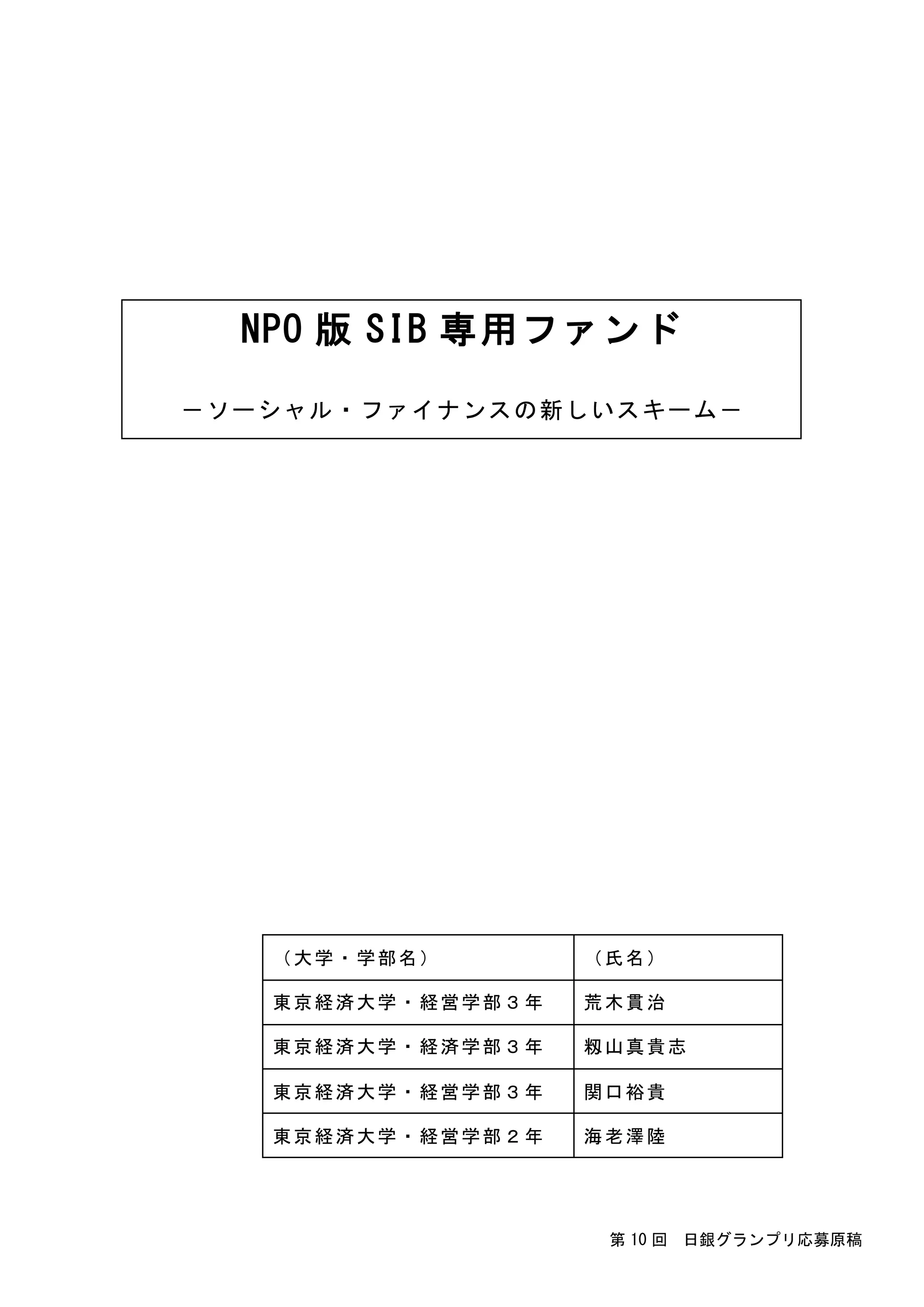 手段を増やすことを目的とした「NPO 版 SIB 専用ファン ド」を提案 したい。