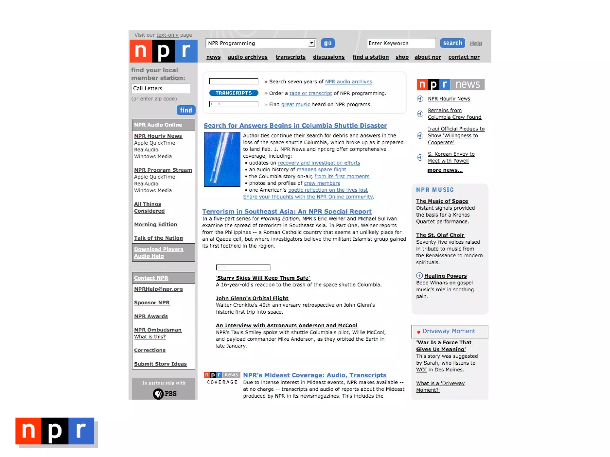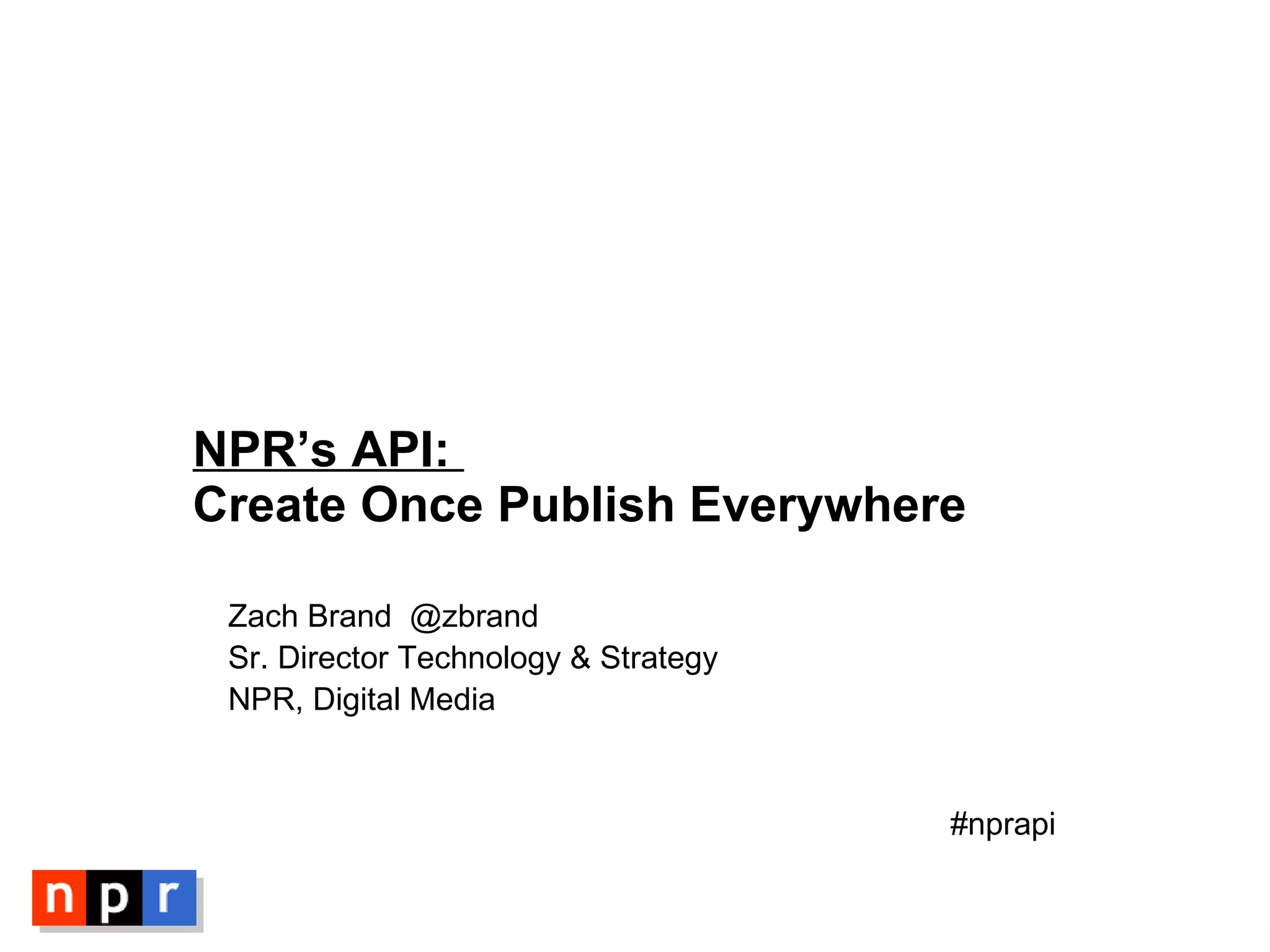 The document discusses NPR's content management strategy of creating content once and publishing it everywhere (COPE) using their API. It outlines the benefits of this approach, including improved development efficiencies, enabling new digital experiences and business opportunities. It also shares lessons learned, such as the need for flexible content structures, clear examples over documentation, and ensuring technology and content teams are aligned. Upcoming improvements to the API are also mentioned, such as image cropping and new output formats.