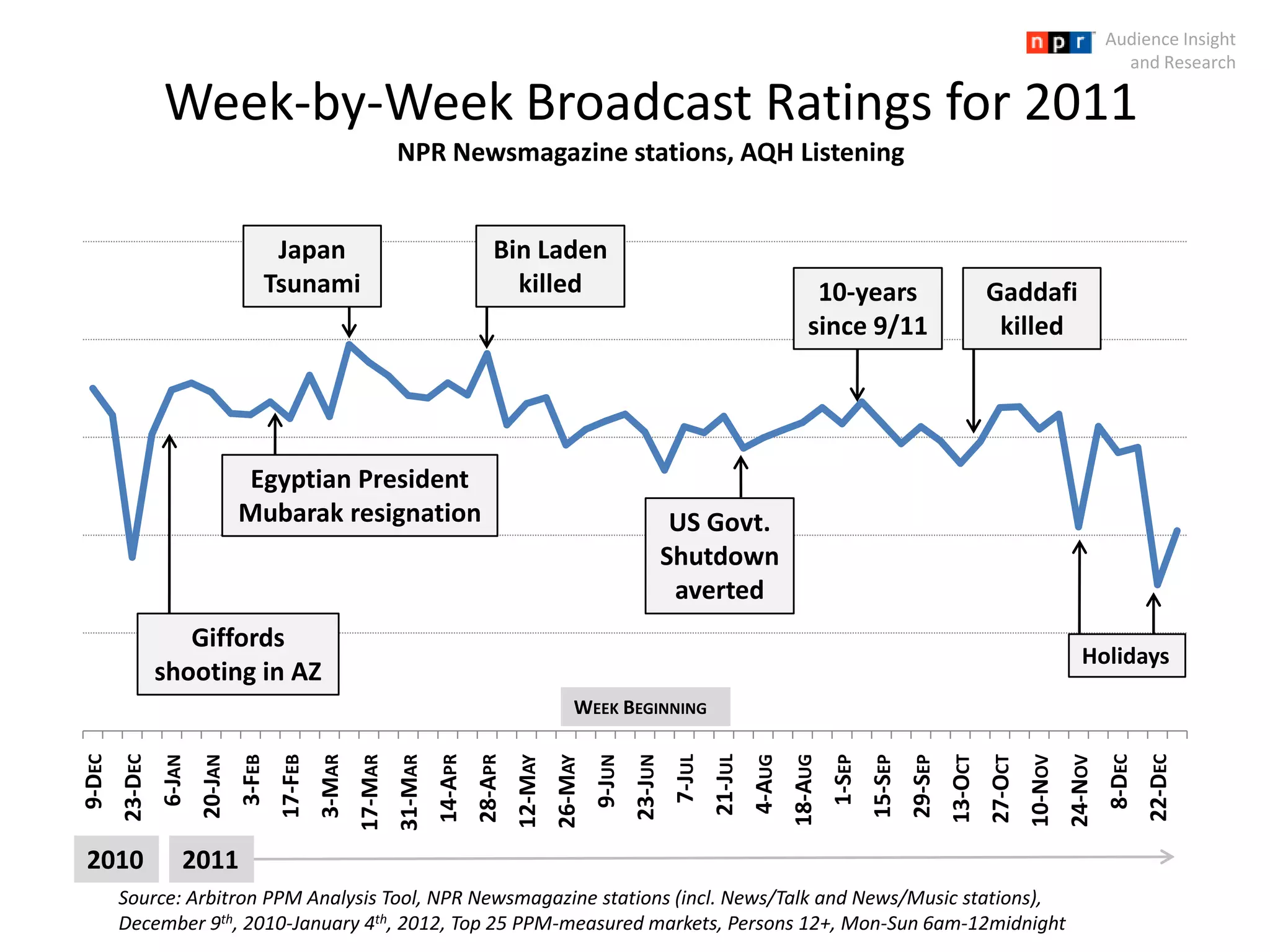 This document shows week-by-week broadcast ratings for NPR newsmagazine stations from December 2010 to January 2012. Major news events are noted along the timeline, including the Japan tsunami, the killing of Osama bin Laden, the 10th anniversary of 9/11, the killing of Gaddafi, the Egyptian president Mubarak's resignation, the Giffords shooting in Arizona, and the US government shutdown being averted. The ratings fluctuate up and down over this period, with some news events corresponding to higher ratings.
