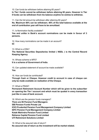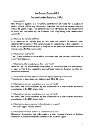 The New Pension System (NPS) is a voluntary pension scheme run by the Government of India. It allows individuals to contribute funds until age 60, at which point they can withdraw up to 60% of their savings, with the remaining 40% used to purchase an annuity to provide a lifelong pension. The NPS has two tiers - Tier I is the primary account required to open Tier II, which allows partial withdrawals but Tier I funds cannot be withdrawn until age 60. Contributions and withdrawals are facilitated through cash, cheque, or other financial instruments. The Pension Fund Regulatory and Development Authority regulates the NPS and involvement of other agencies such as pension fund managers, record keepers, and point