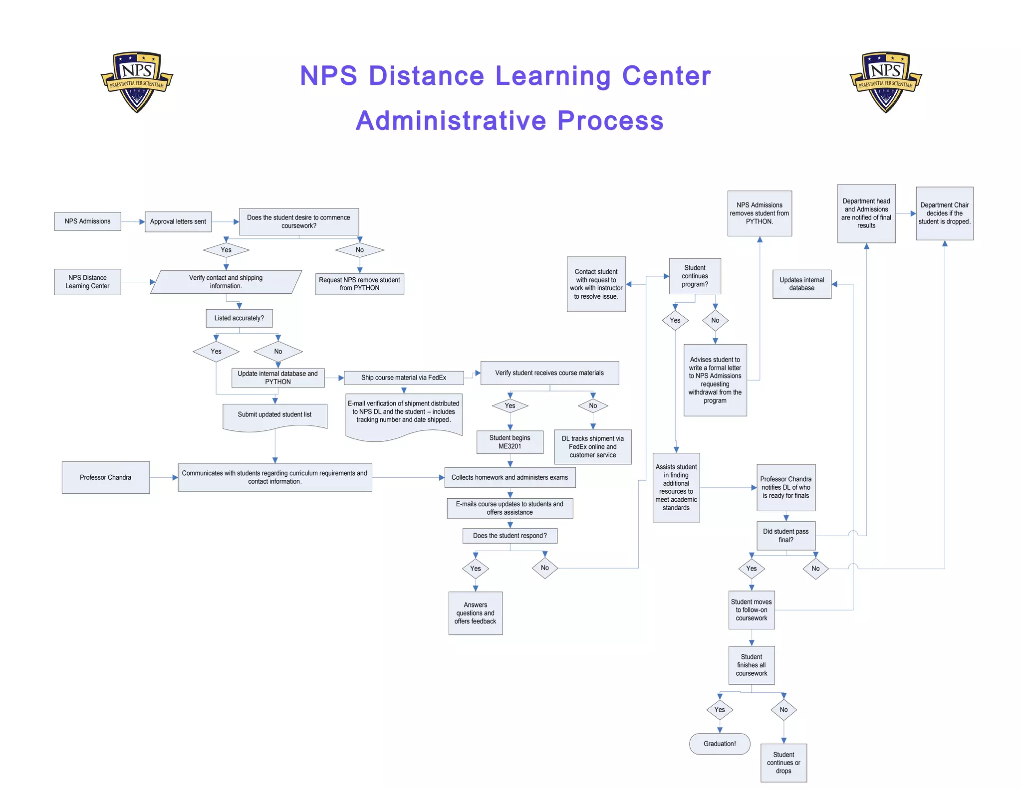 The document outlines the administrative process for the NPS Distance Learning Center, detailing the steps from student admission to course material shipment and tracking. It includes communication procedures between students and faculty, verification of student information, and support for both academic progress and withdrawal requests. The document highlights the final evaluation process and notifications to relevant departments regarding student outcomes.