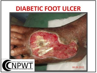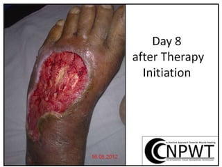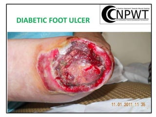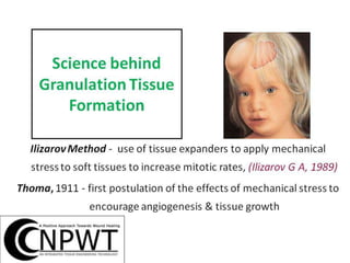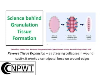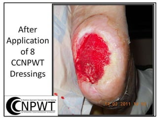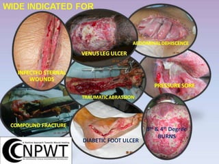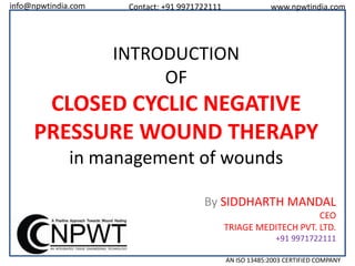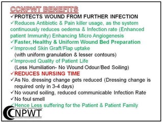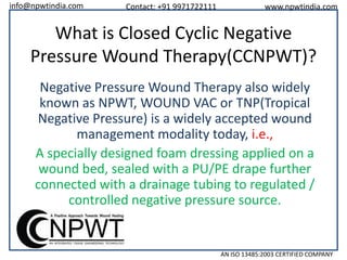 The document provides an overview of Closed Cyclic Negative Pressure Wound Therapy (CCNPWT) and its role in wound management, including the mechanism by which it promotes healing, such as tissue decompression and stimulation of granulation tissue formation. It outlines the types of wounds that are suitable for CCNPWT, contraindications, benefits, and the dressing application technique. Additionally, it emphasizes the importance of monitoring, managing co-morbid conditions, and adjusting treatment based on wound assessments.