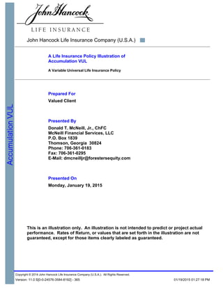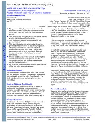 This document is a life insurance policy illustration for a Variable Universal Life Insurance policy for Valued Client. It provides assumptions used in the illustration, including personal details of the client, initial death benefit and premium amounts, investment allocations, charges, and other policy details. The purpose is to show how the underlying investments could affect the policy surrender value and death benefit over time. It also notes that rates of return and values shown are not guaranteed except where clearly labeled.