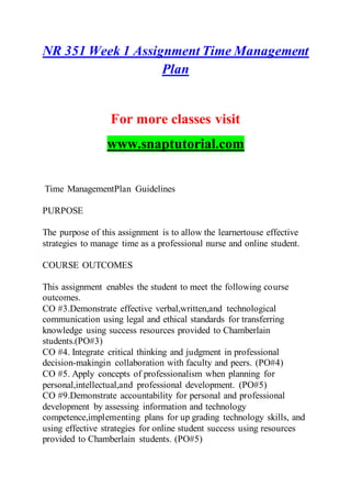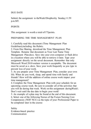 The document outlines a series of assignments and discussions for a nursing course, focusing on time management strategies, competencies for future nurses, and professional development. Students are required to submit various assignments, including a time management plan and professional paper, while adhering to specific guidelines and deadlines. Emphasis is placed on effective communication, critical thinking, and the integration of evidence-based practice within nursing.