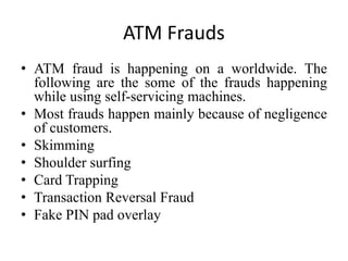 ATM fraud is a global issue predominantly caused by customer negligence and includes methods such as skimming, shoulder surfing, card trapping, transaction reversal fraud, and fake pin pad overlays. Skimming involves stealing data from card magnetic strips, while shoulder surfing entails observing PIN entry. Additional methods like card trapping physically retain cards to allow thieves to access accounts, and transaction reversal fraud creates the illusion that cash was not dispensed to illegally recredit accounts.