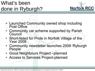 The document discusses efforts taken in the village of Ryburgh, North Norfolk to strengthen their community. It describes how the village launched a community-owned shop and post office, started a community car scheme, and were shortlisted for an award. This was enabled by village residents investing in the shop, identifying issues like access, and effective consultation. The opening of the shop in 2009 has served as a community hub. Challenges included the closure of services, but new initiatives like the Good Neighbor Project aim to support isolated residents through volunteer assistance.