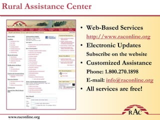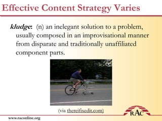 The document discusses strategies for developing an effective online content strategy for rural health organizations. It defines content strategy and discusses identifying target audiences through personas. It also covers analyzing existing content, identifying gaps, and distributing content through various online channels. The goal is to provide useful, up-to-date health information to rural users through an organized content strategy.
