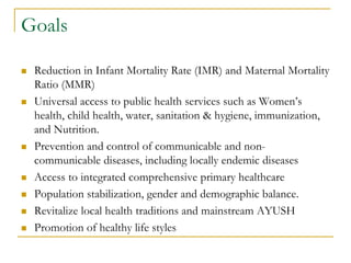 The document discusses the National Rural Health Mission (NRHM) in India. It outlines the goals of NRHM which include reducing infant and maternal mortality, increasing access to public health services, and controlling communicable and non-communicable diseases. It describes the expected outcomes by target years, components of NRHM, major stakeholders like ASHA workers, and the plan of action involving community health centers. It also summarizes innovations in rural healthcare delivery in Assam state, India including boat clinics, mobile medical units, and public-private partnerships.