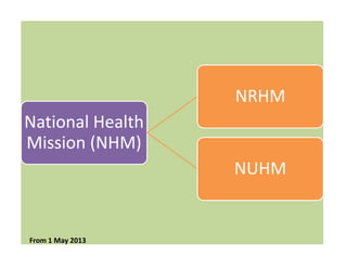 The document outlines the National Rural Health Mission (NRHM) in the context of maternal and child health in Maharashtra, focusing on its vision, goals, core strategies, and action plans to enhance healthcare access and quality. Key initiatives include the integration of community health practices, strengthening of health infrastructure, and emphasis on maternal and child healthcare programs aiming to reduce mortality rates and improve service delivery. It highlights the need for increased public health funding, improved management systems, and community empowerment through local health committees.