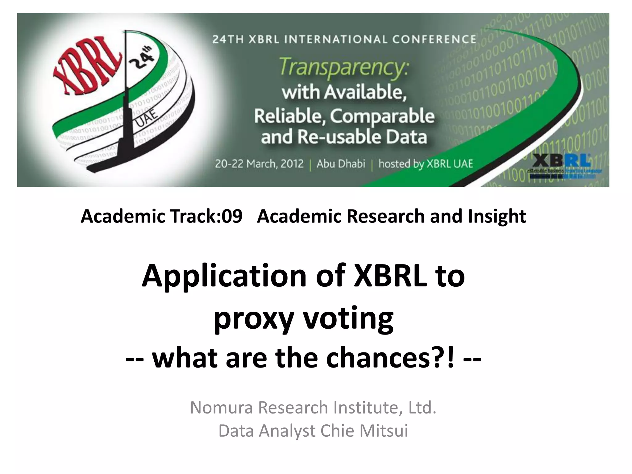 This document discusses using XBRL (eXtensible Business Reporting Language) to help institutional investors more efficiently analyze company agendas and vote in shareholder meetings. It outlines current issues with proxy voting in Japanese companies, and proposes using XBRL to tag past financial reports, current agendas, and voting policies to allow screening of companies. This could help investors globally access qualitative information and better monitor company performance and governance. Several challenges are noted, including standardizing the "facts" and terminology tagged in XBRL. Overall, the document examines the feasibility and potential benefits of using XBRL to improve transparency and efficiency in the proxy voting process.