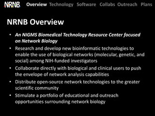 The National Resource for Network Biology (NRNB) held its External Advisory Council meeting on December 12, 2012. The NRNB is focused on developing network biology tools and collaborating with investigators. It oversees various technology research and development projects, software releases including Cytoscape 3.0, collaboration projects, and outreach/training events. The meeting agenda covered progress updates and sought advice on future plans.