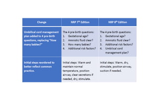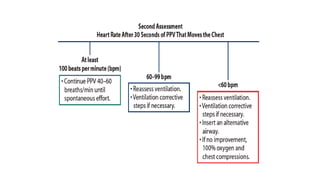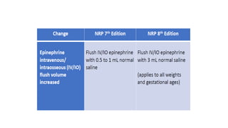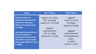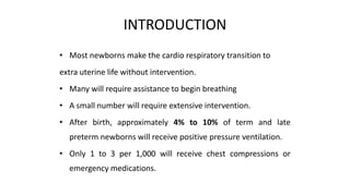 This document provides guidance on neonatal resuscitation from the 8th edition of the Neonatal Resuscitation Program. It discusses that most newborns transition well after birth, but some require assistance with breathing or extensive intervention. It outlines the initial assessment of the newborn including airway, breathing, circulation, and interventions such as positive pressure ventilation, chest compressions, and medications if needed. It emphasizes effective communication and teamwork during resuscitation. The focus is on assisting the transition to extrauterine life through ventilation of the lungs and supporting circulation as needed.