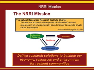The NRRI Coleraine Laboratory was originally a US Steel research facility and now supports research at the University of Minnesota. It has engineering expertise in areas like mineral processing and pyrometallurgy. The lab contains various facilities for chemical analysis, mineral characterization, and processing tests from bench to pilot scale. In recent years it has expanded its capabilities to include alternative fuels research like biomass characterization. A new project aims to develop and demonstrate a technology for efficiently producing electricity from locally available biomass resources in Minnesota to reduce greenhouse gas emissions and utilize the state's forest resources.