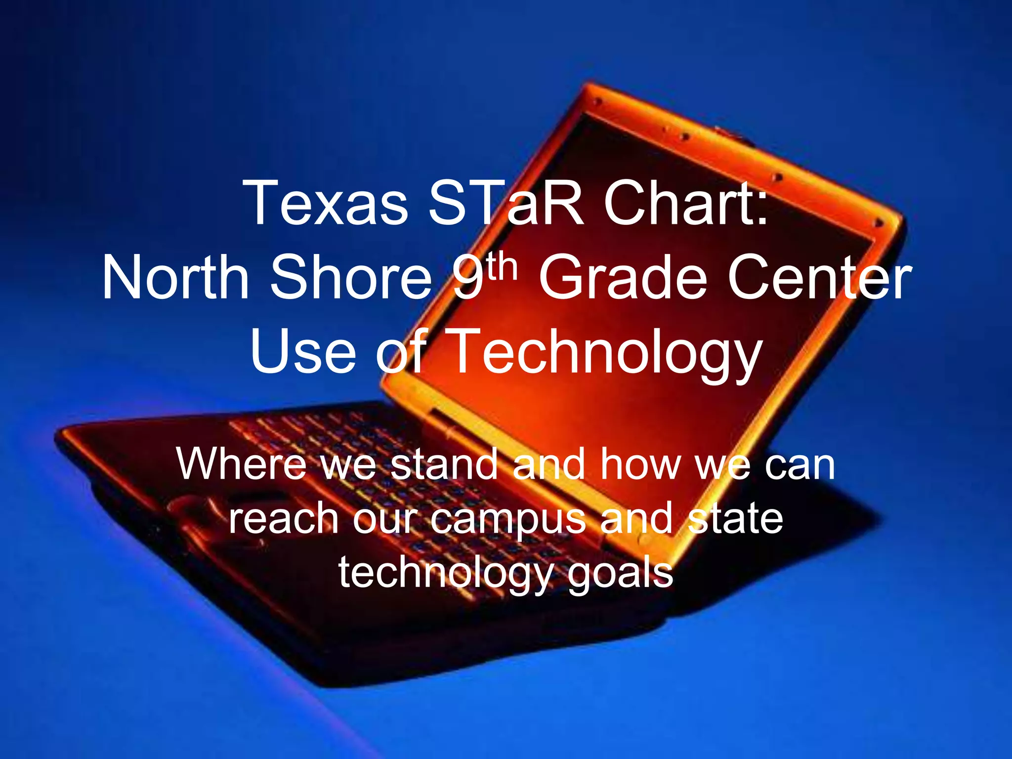 This document summarizes a meeting about using technology at North Shore 9th Grade Center based on the Texas STaR Chart. It discusses the school's performance in four key areas: Teaching and Learning, Educator Preparation and Development, Leadership/Administration/Support, and Infrastructure. While Infrastructure and Support are strong, Teaching/Learning and Educator Preparation need improvement. The school aims to incorporate more real-world technology use into curricula and ensure teachers are prepared to use technology effectively. Next steps include working with departments to add technology to lessons, attending trainings, and utilizing support staff.