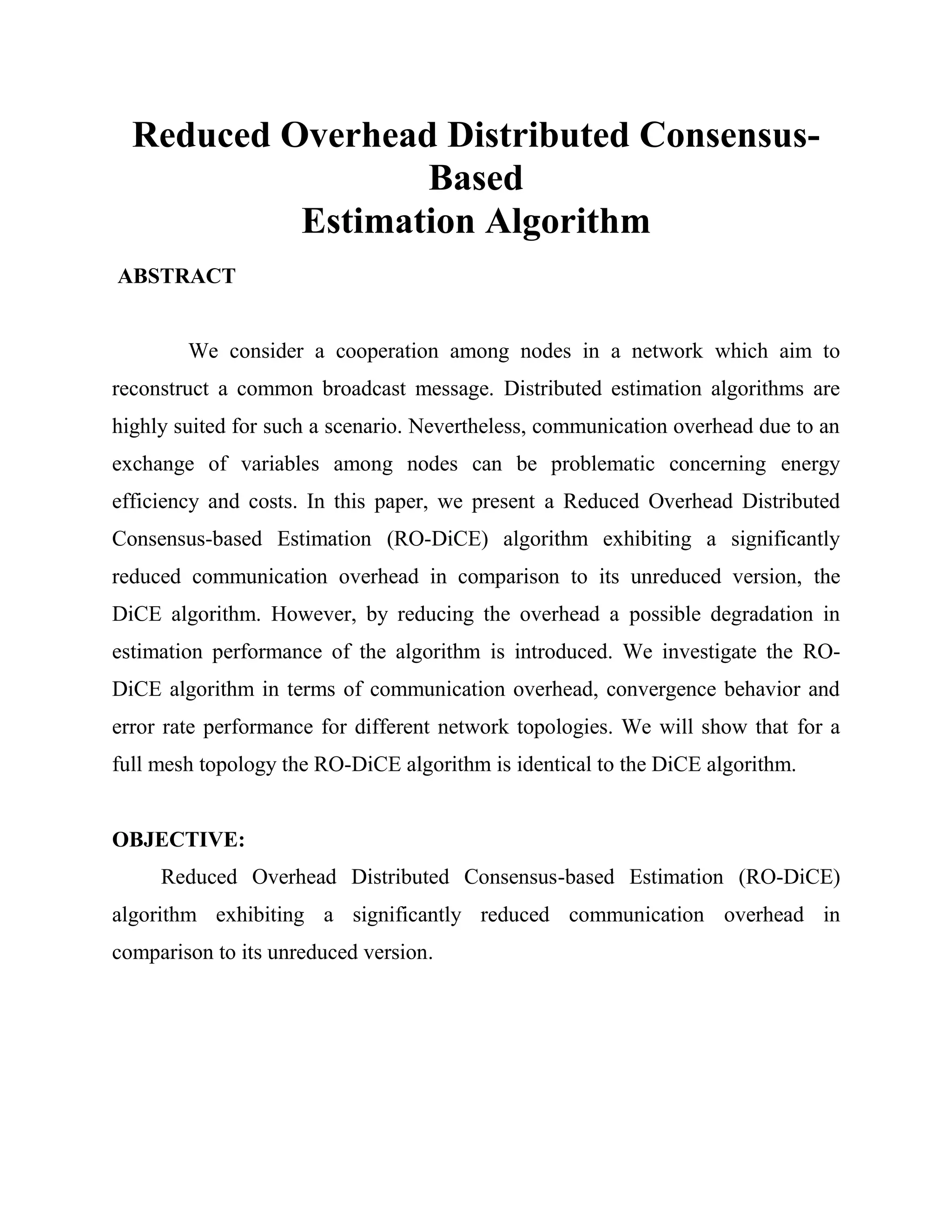 The document presents a Reduced Overhead Distributed Consensus-based Estimation (RO-DiCE) algorithm that significantly reduces communication overhead compared to the original DiCE algorithm. RO-DiCE avoids exchanging quantities between nodes in a unicast fashion like DiCE. The paper investigates RO-DiCE in terms of communication overhead, convergence behavior, and error rate performance for different network topologies, showing it is identical to DiCE for full mesh networks.