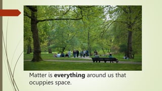 Matter is anything that takes up space and has mass. There are different types of substances that make up matter, including water, wood, and air. Matter can exist in three states - solid, liquid, and gas - which are distinguished by whether they have a fixed shape and volume. All matter has properties of mass and volume.