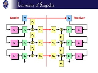 The document discusses several modes of operation for block ciphers and stream ciphers. It explains that block cipher modes like CBC, CFB, OFB, and Counter Mode require an initialization vector (IV) to provide randomization and prevent identical plaintext blocks from encrypting to the same ciphertext. The IV must be transmitted along with the ciphertext and never reused with the same key. Stream ciphers like RC4 generate a pseudorandom key stream that is XORed with plaintext bytes to produce ciphertext.