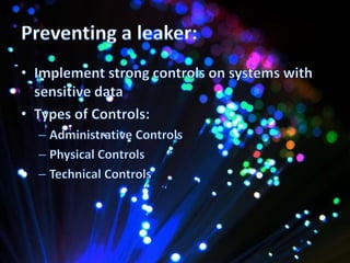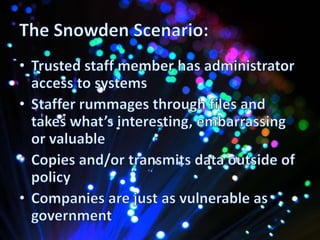 This presentation covers what I am calling the 'Snowden Scenario.' This is when a privileged insider uses their power to steal data from an organization. If it can happen to the NSA, your organization is at risk too. Background checks, credentials and insurance isn't enough if your most valuable assets are leaked to the world.