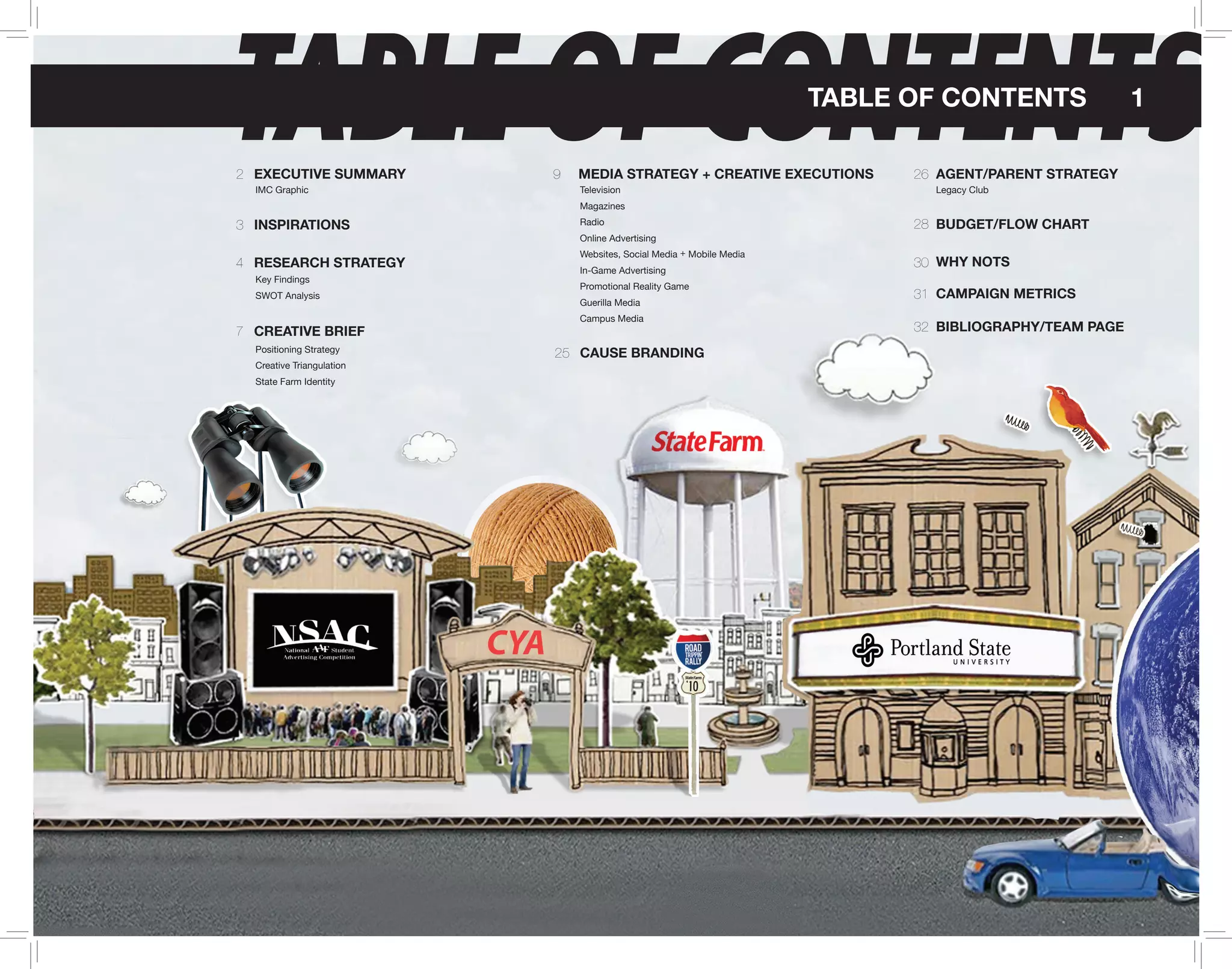 This document provides an executive summary of a marketing campaign for State Farm auto insurance. Key highlights include reaching over 1 billion target impressions through a 13-month multimedia strategy. The campaign leverages a "road trip" metaphor and positions agents as travel accessories. It uses the creative strategy of "CYA" and engages audiences through an interactive promotional game. Branding and community initiatives empower customers and agents to make local impacts. Research inspired the campaign from diverse sources like Old Spice, Nike+, and Farmville to emotionally engage audiences.