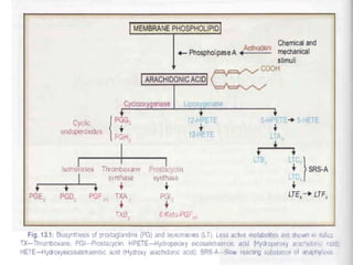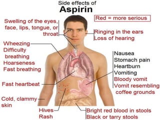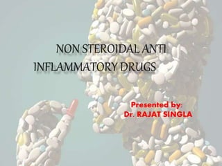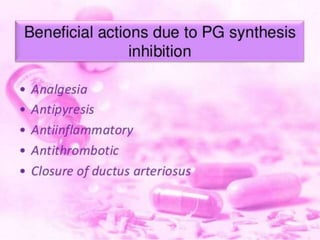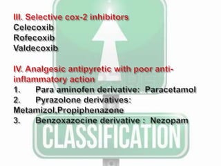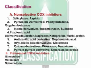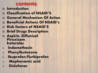 This document discusses non-steroidal anti-inflammatory drugs (NSAIDs). It covers the classification of NSAIDs, their general mechanism of action involving inhibition of cyclooxygenase (COX) enzymes, and their beneficial and risk factors. Specific NSAIDs discussed include aspirin, diflunisal, piroxicam, indomethacin, ibuprofen, ketorolac, mephenamic acid, diclofenac, and selective COX-2 inhibitors. The roles of NSAIDs in periodontics and controlling disease progression are examined. Current recommendations and the role of NSAIDs in the future are also mentioned.